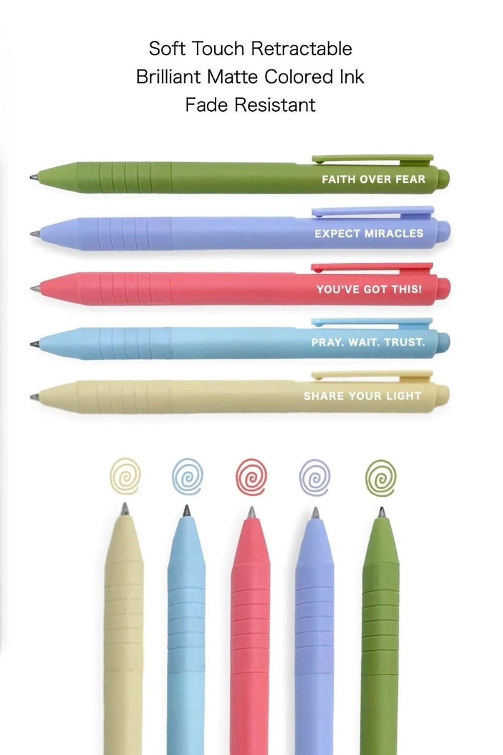 You will love these retractable gel pens with their FUN matte and fade resistant colors. The happy colored pure gel ink matches the soft touch pen barrel that features a comfortable grip for ease during lengthy writing or note taking sessions. The 0.5 fine-point gel tip applies smoothly and applies matte bold ink that dries fast. It will make this pen your new favorite! These pens are the perfect partner to your favorite journal or to-do list. They come in a set of 5 each with a happy inspirational quote meant to motivate, cheer and brighten your thoughts. So whether you’re doodling, drawing, journaling, note taking, making your to-do list, or letter writing, your words will WRITE HAPPY! The colors! The sayings! The packaging! We did it WRITE and they will make you so HAPPY to have for yourself and to gift to family and friends. From the drop down menu you can choose your favorites or collect them all!