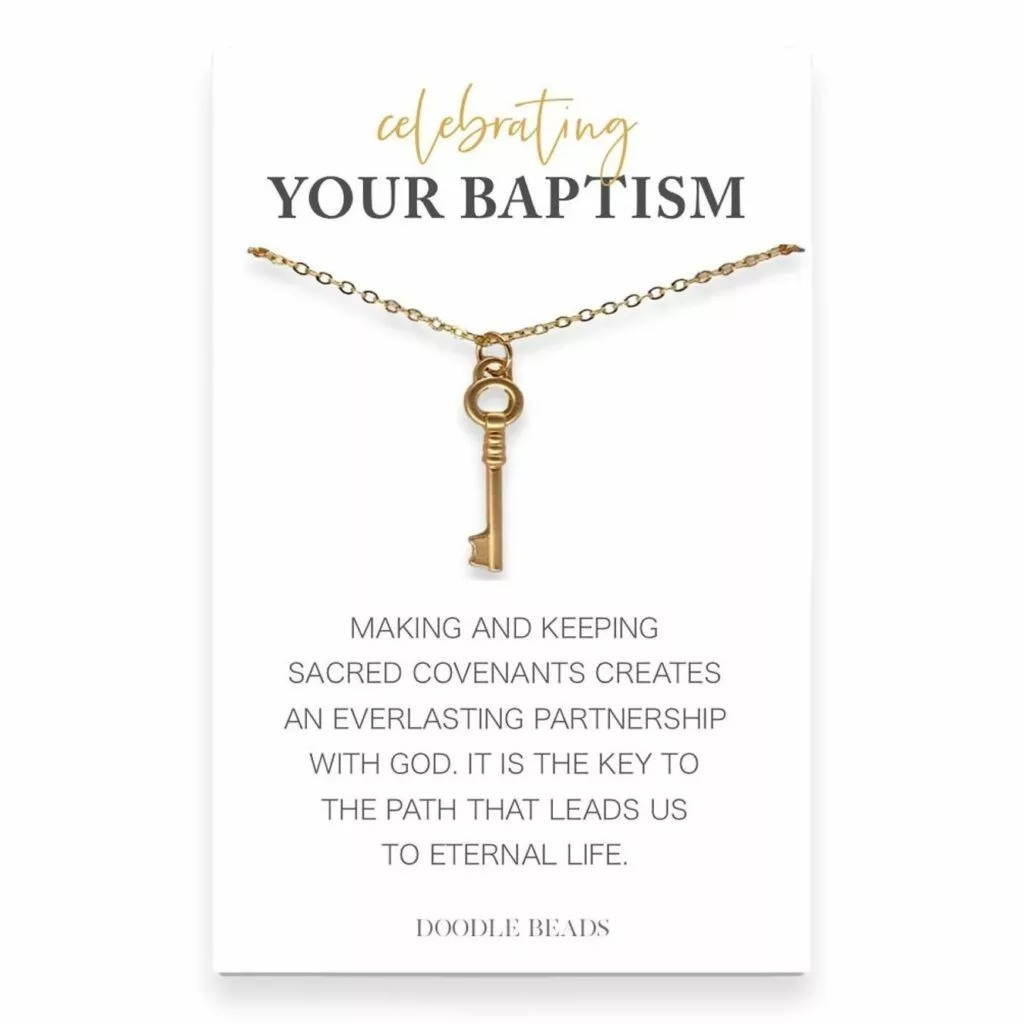 Beautiful and dainty key necklace paired with “Celebrating your Baptism” Card makes a perfect baptism gift for girls, youth or women. Wearing this necklace will serve as a simple reminder to her that making and keeping sacred covenants creates an everlasting partnership with God. It is the key to the path that leads to eternal life. A popular trendy necklace carded with a powerful message! Available in silver or gold.