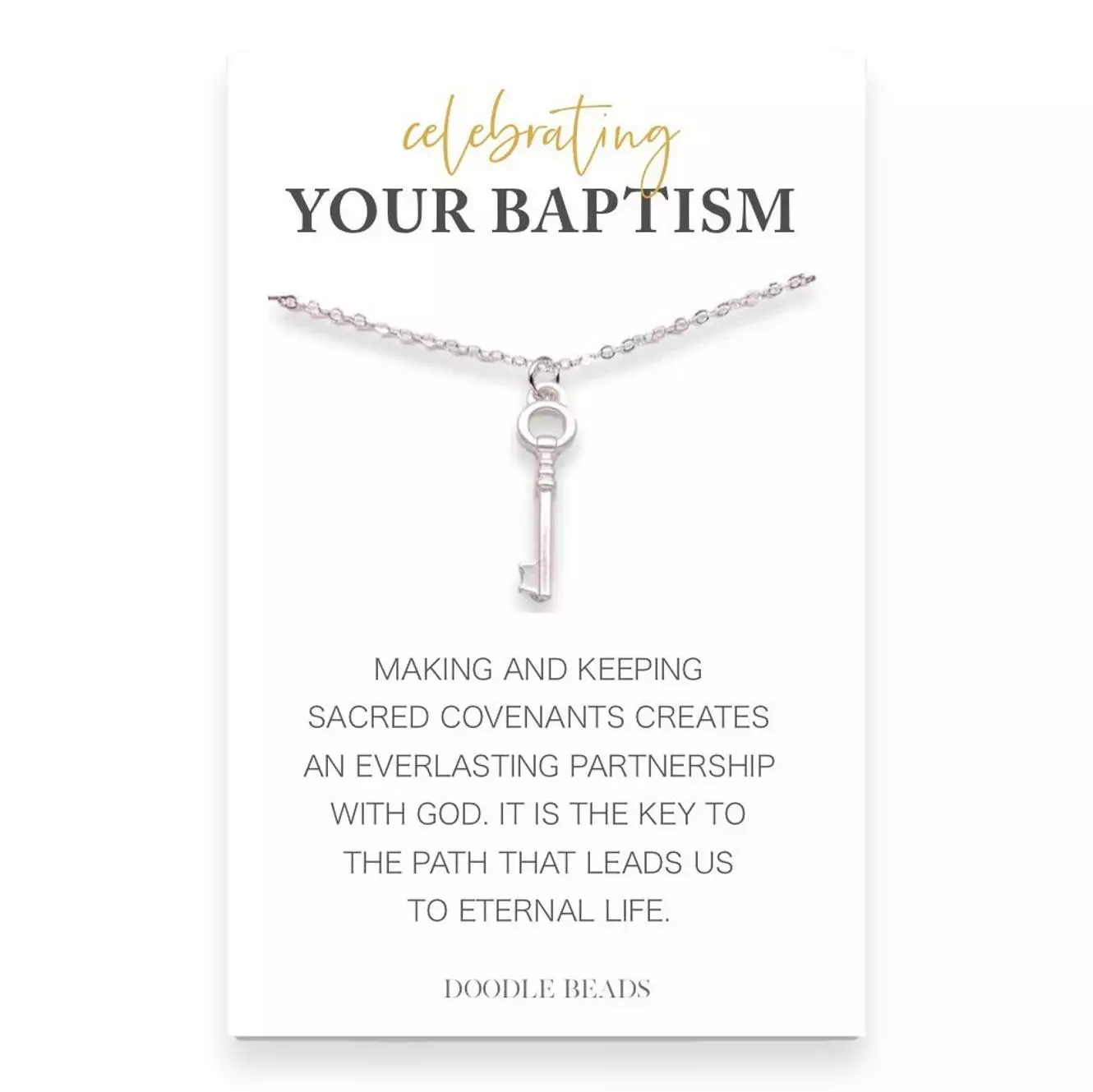 Beautiful and dainty key necklace paired with “Celebrating your Baptism” Card makes a perfect baptism gift for girls, youth or women. Wearing this necklace will serve as a simple reminder to her that making and keeping sacred covenants creates an everlasting partnership with God. It is the key to the path that leads to eternal life. A popular trendy necklace carded with a powerful message! Available in silver or gold.
