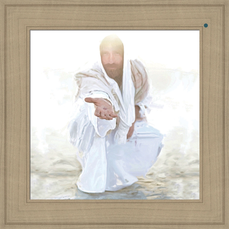 Emerging LDS artist Haley Miller captures a modern and joyful image of Jesus Christ smiling and reaching His hand out towards the viewer. It reminds us that Christ is always reaching for us. All we need to do is take His hand. He is our rescuer. Haley Miller’s captivating portrait will bring light and inspiration into your home. This unique piece of LDS art feels loving and calm and will evoke a sense of peace throughout your space. Add this beautiful statement piece to your LDS art collection.