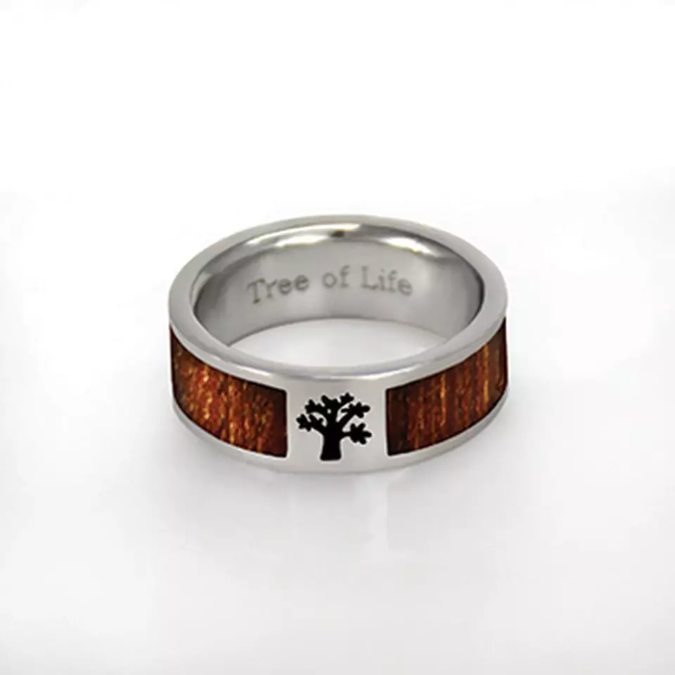 This stainless steel ring features a tree design surrounded with wood inlay.