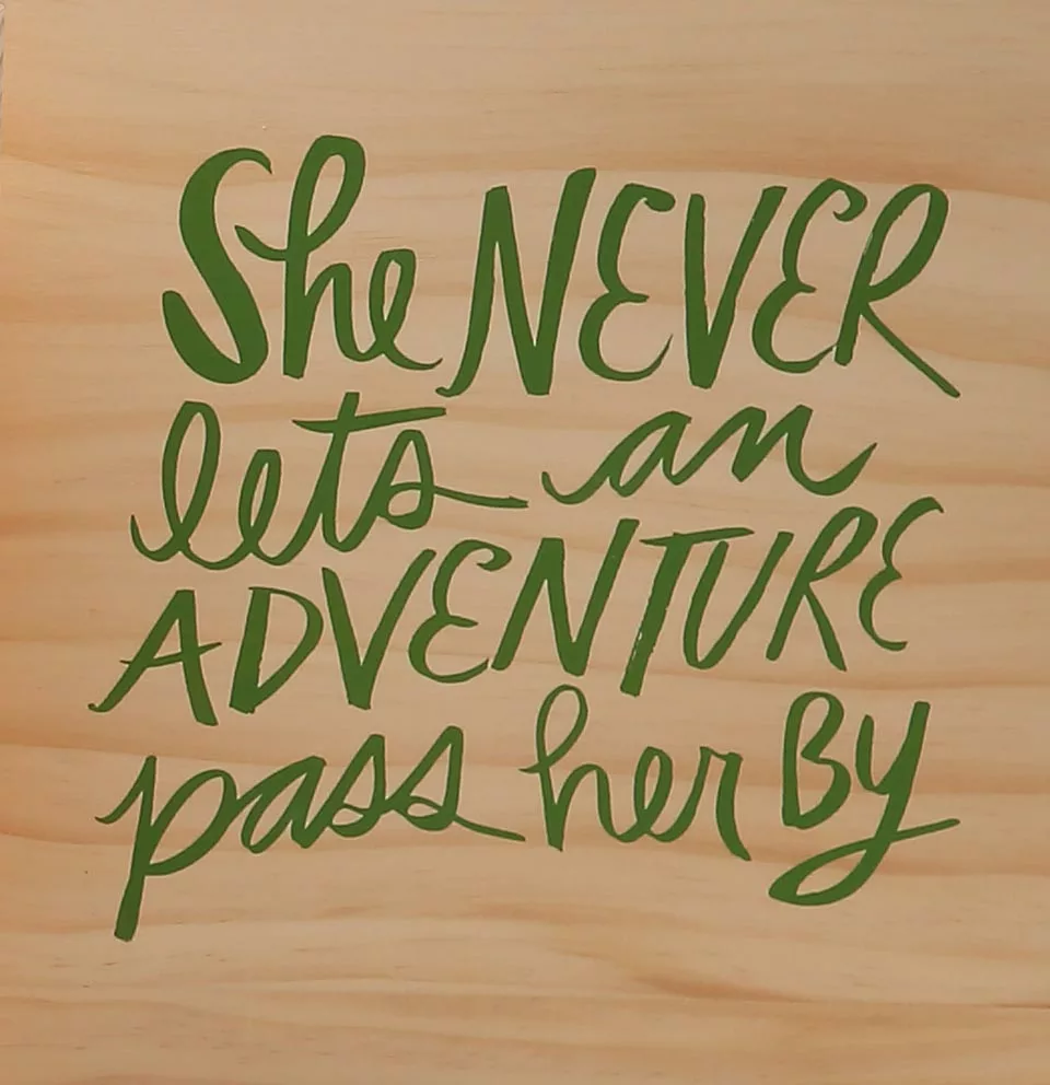 This 10×10 plaque features the saying “She Never Lets An Adventure Pass Her By”.