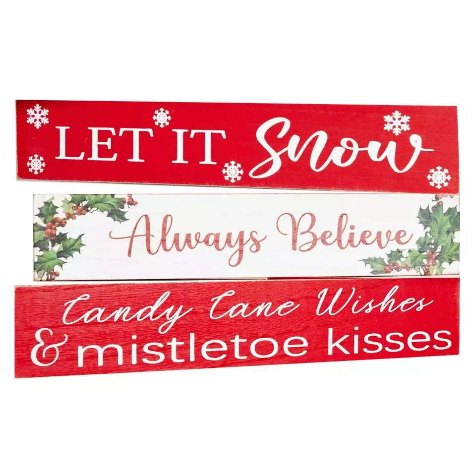 Choose your message: Let it Snow, Always Believe, or Candy Cane Wishes and Mistletoe Kisses. Adorable signs will elevate your home Christmas decor this season. Place one of these Christmas shelf sitters on your mantel, bookshelf, or table setting for a boost of Christmas spirit. These delightful signs would also make a great gift for friends.