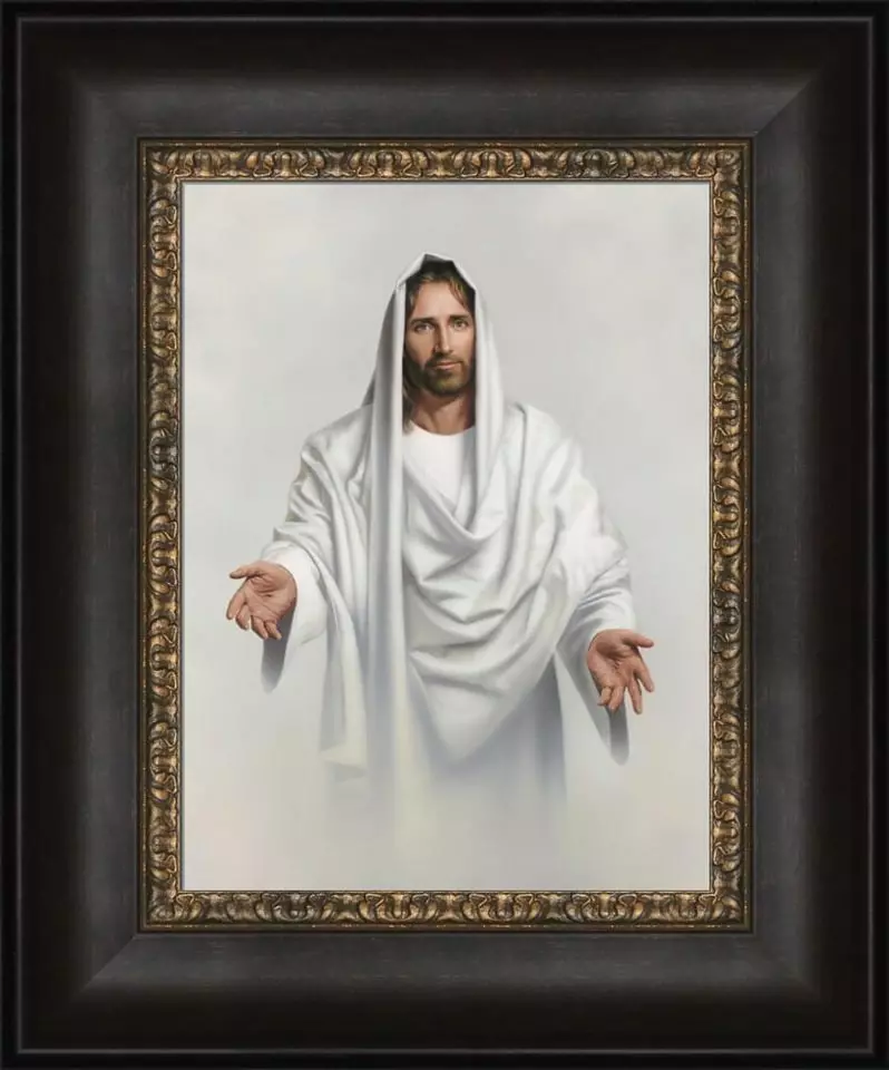 In this painting I wanted to depict the Savior with open arms, welcoming and inviting us to come unto Him, the Prince of Peace. My intention was to create an expression of His softness, forgiveness, and understanding for He knows us and seeks after us that we may find rest and peace in Him. I can imagine that in such an instance all other details and personal insecurities will fade away , and because of this I intentionally painted Him in white with a soft white background with no other details to distract us from Him. If we will follow Him and learn of Him we will truly find ourselves in His rest. ~ Simon Dewey