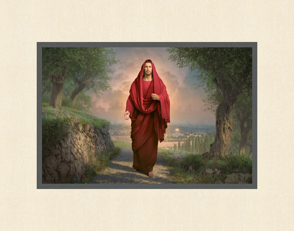 This beautiful matted print by Simon Dewery features Jesus in a red robe walking along a path surrounded by pretty greenery.