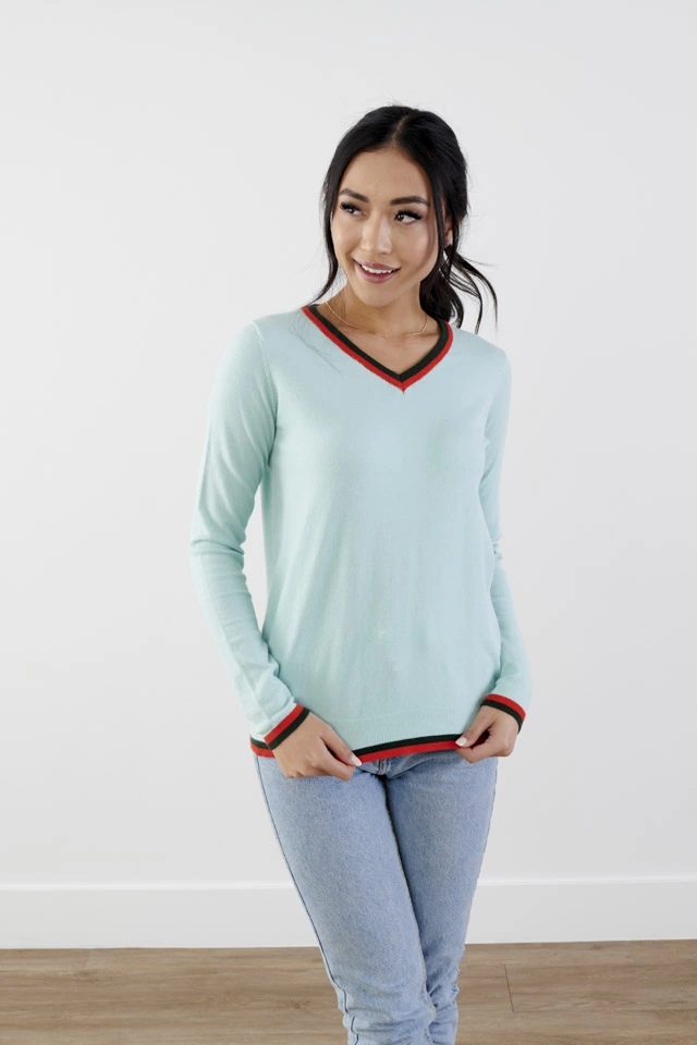 Find your forever favorite sweater in this classic v-neck top that offers comfort, style, and a breathtaking shade of heavenly blue.