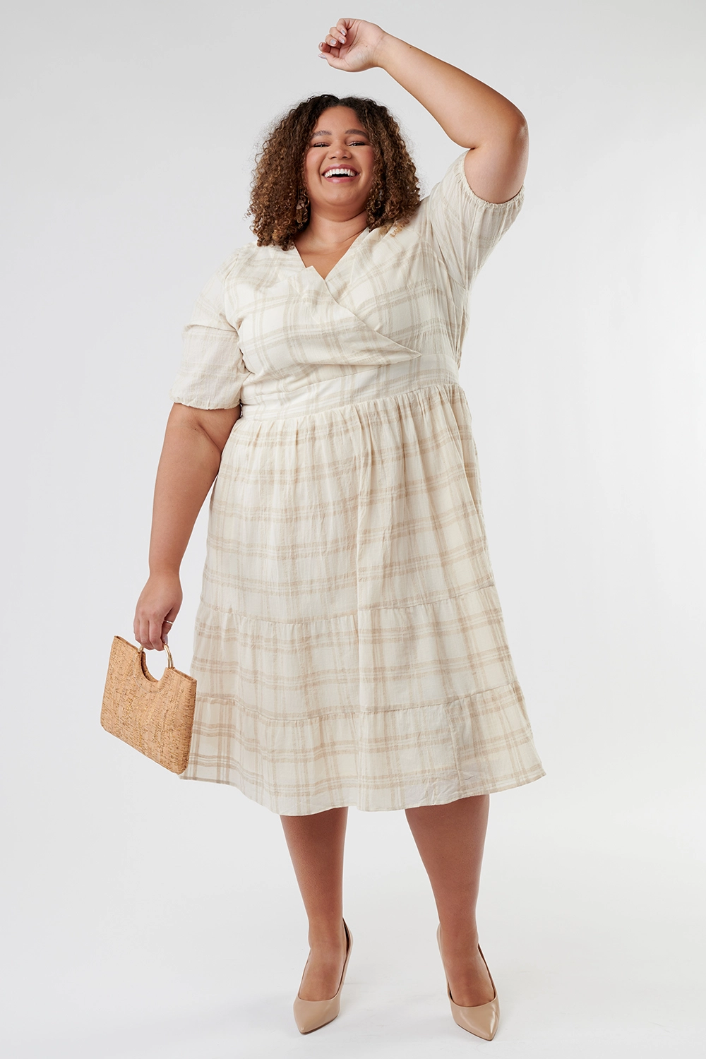 Tiered skirts and puffed sleeves are must-haves this year. This dress has a convenient snap button at the neck, which also makes this dress completely nursing friendly.