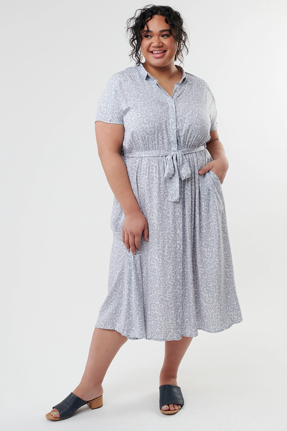 This dress is the perfect blend of a classic button down and a lovely dress. Featuring a collar neck, tie waist, and and a delightful polka dot pattern, this midi dress will have you feeling beautiful and fun.