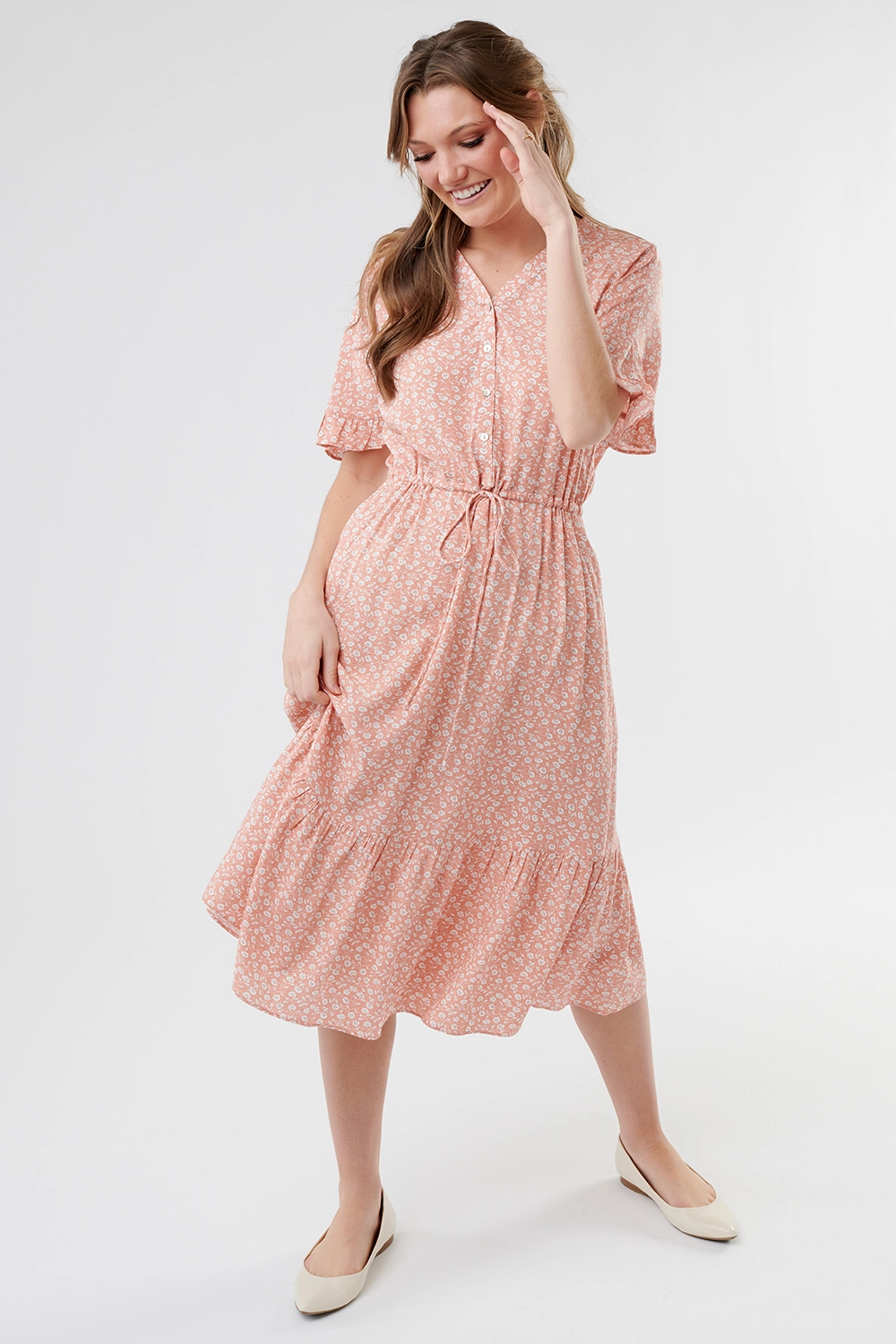 Spruce up your style with this delightful midi dress! Featuring dolman sleeves, functional buttons, and a drawstring waist, this dress is pretty close to perfection.