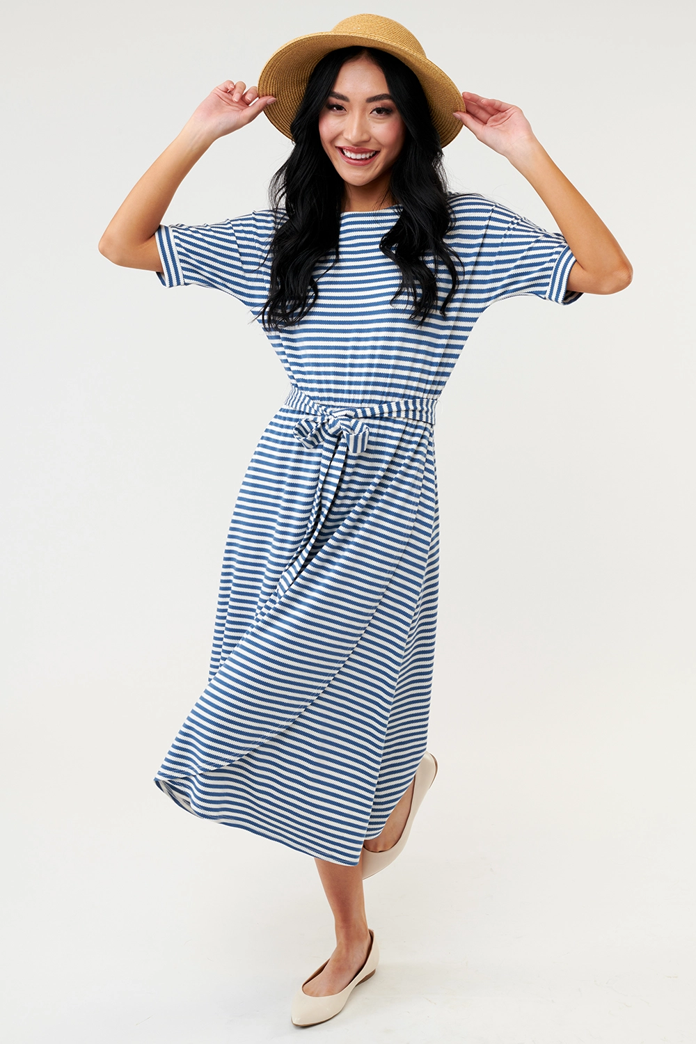 Feel comfortable and confident in our dolman sleeve wrap dress. With a flattering a-line skirt and a tie waist, this midi dress will add a fresh flair to your style this season.