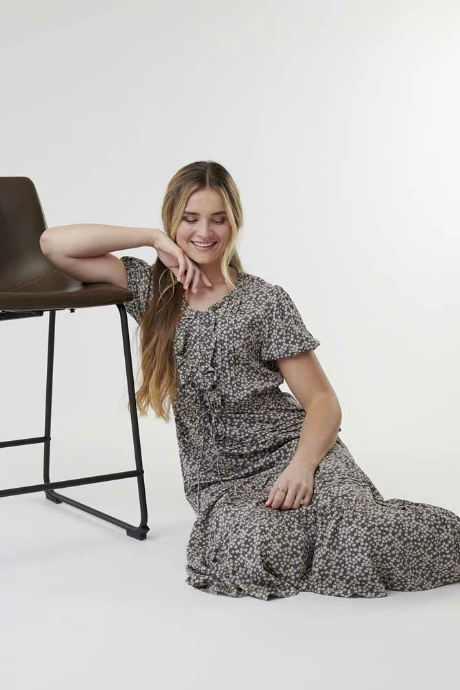 We know you are going to love this beautiful button down dress with a ruffle placket front and pin-tuck skirt. It also has pockets, a drawstring waist, and is nursing friendly!