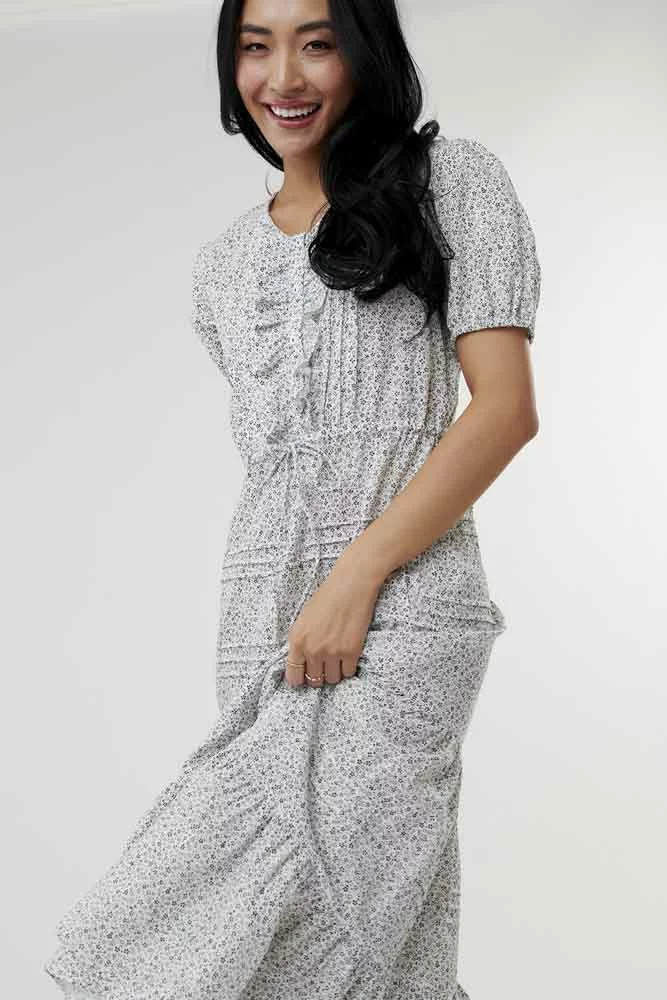We know you are going to love this beautiful button down dress with a ruffle placket front and pin-tuck skirt. It also has pockets, a drawstring waist, and is nursing friendly!