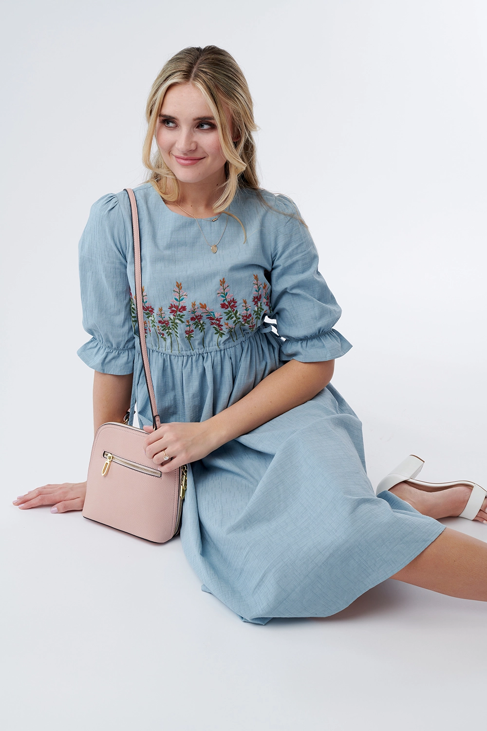 With gorgeous floral embroidery and a side waist tie, this dress will have you ready to step into spring feeling beautiful and bright.