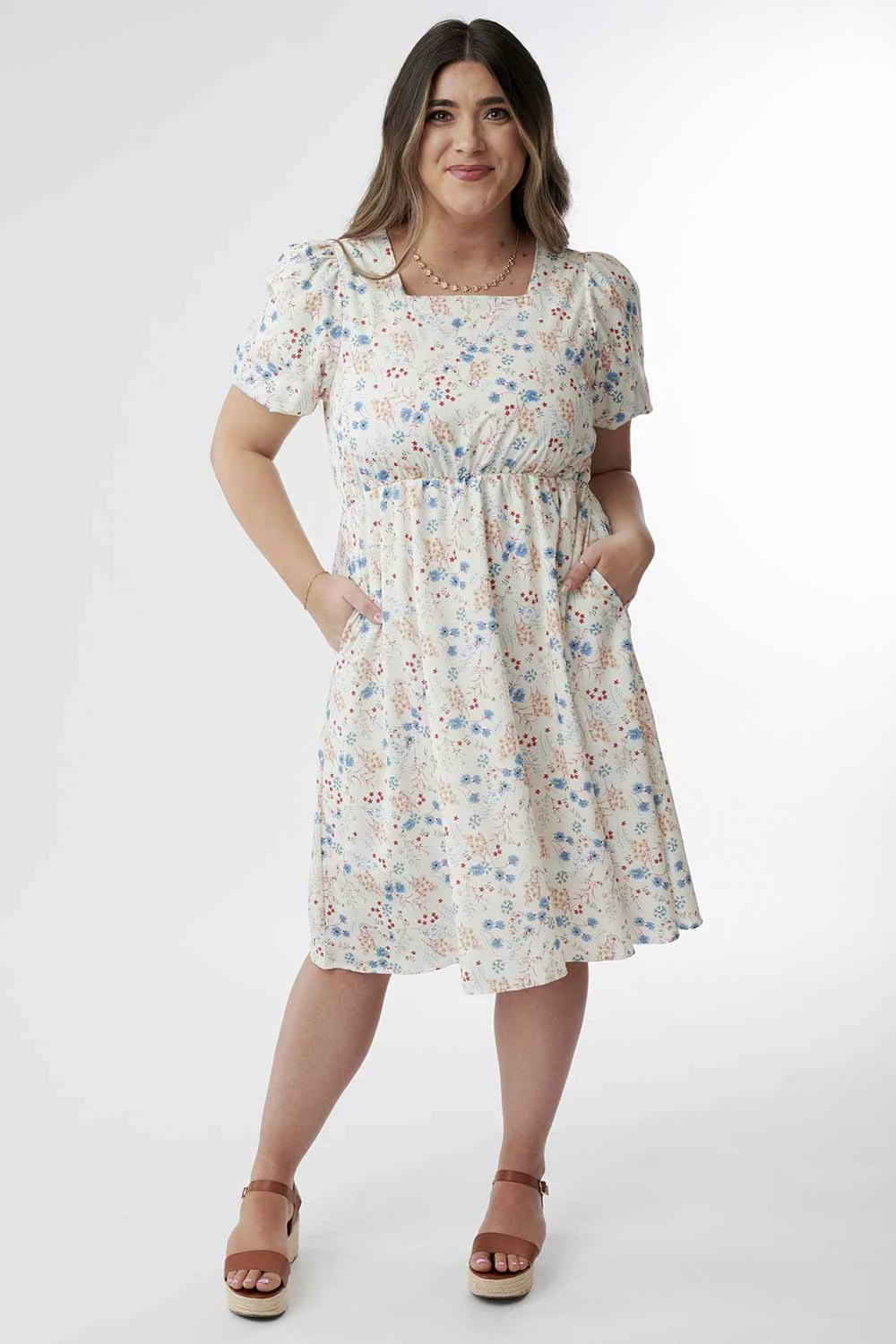Floral print is in, and we are loving every second of the season of flowers. This darling floral dress has a flattering square neckline, and the puffed sleeves add the perfect amount of volume to the dress silhouette.