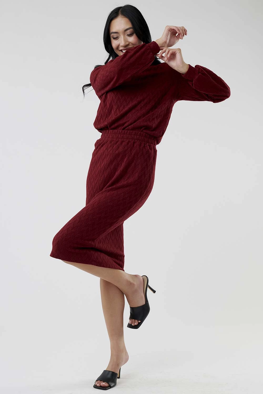 Made from soft knit fabric, this knee-length skirt will be your new go-to when you want easy flair and no fuss.