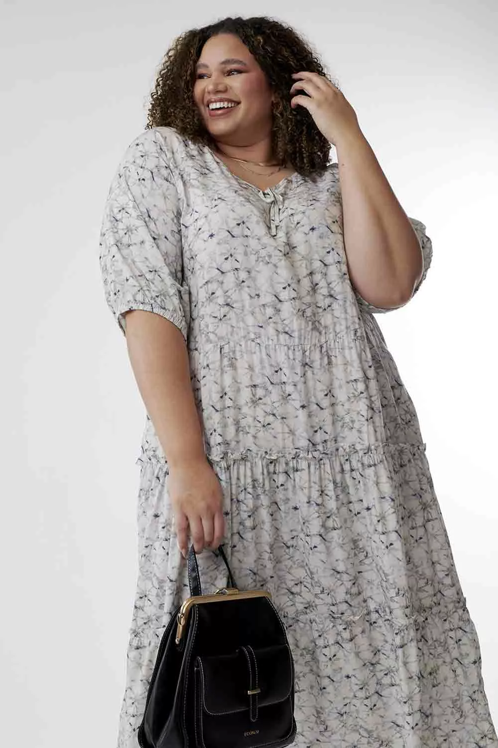 Tie-dye is making a comeback, and we are here for it! This ruffle-tiered dress has a tie neck, puff sleeves, pockets, and a midi-length skirt to go with the vintage pattern.