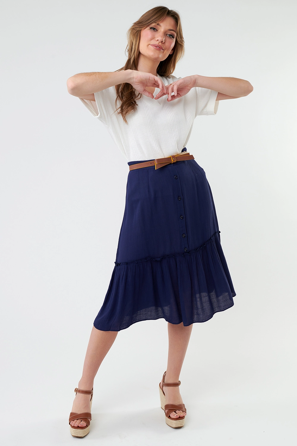 This midi skirt is a blend of playful and professional. With a classic a-line design and fun buttons down the front, you’ll be ready for any event with this number.