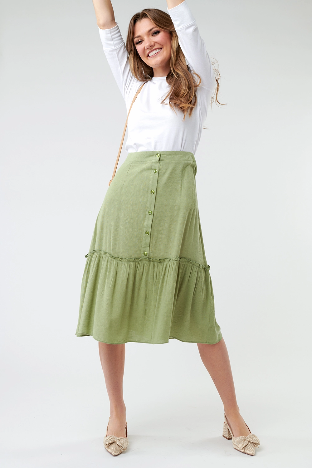 This midi skirt is a blend of playful and professional. With a classic a-line design and fun buttons down the front, you’ll be ready for any event with this number.