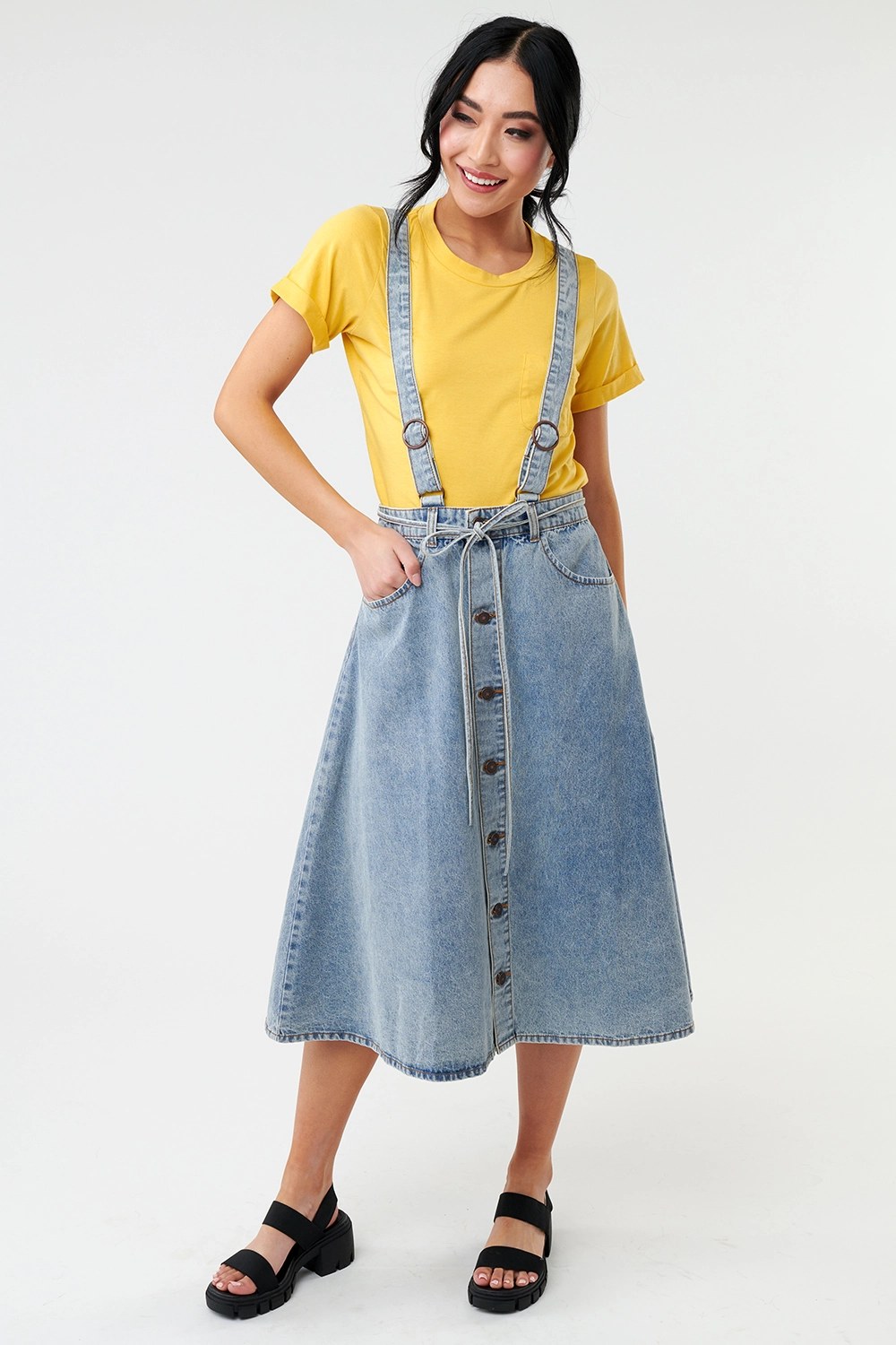 You’ve heard of overalls, but what about overall skirts? This midi length skirt combines classy and casual with cute buttons down the front and adjustable straps.