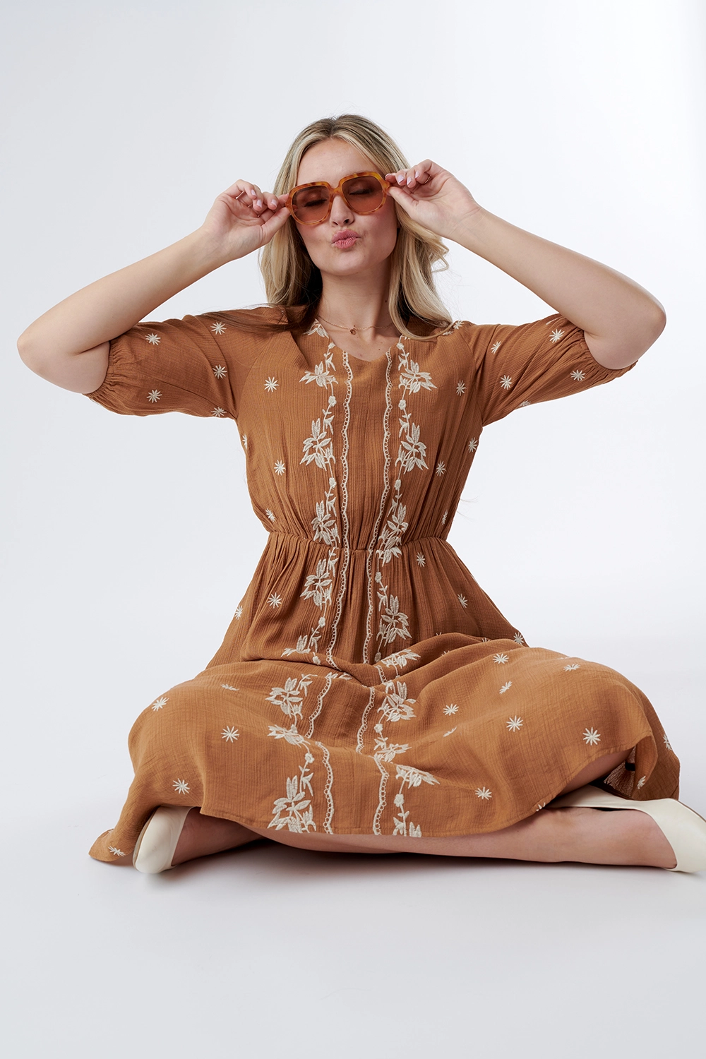 Get ready to feel like the princess you are with this beautiful midi dress. The delicate embroidered flowers add the perfect touch of detail and femininity.