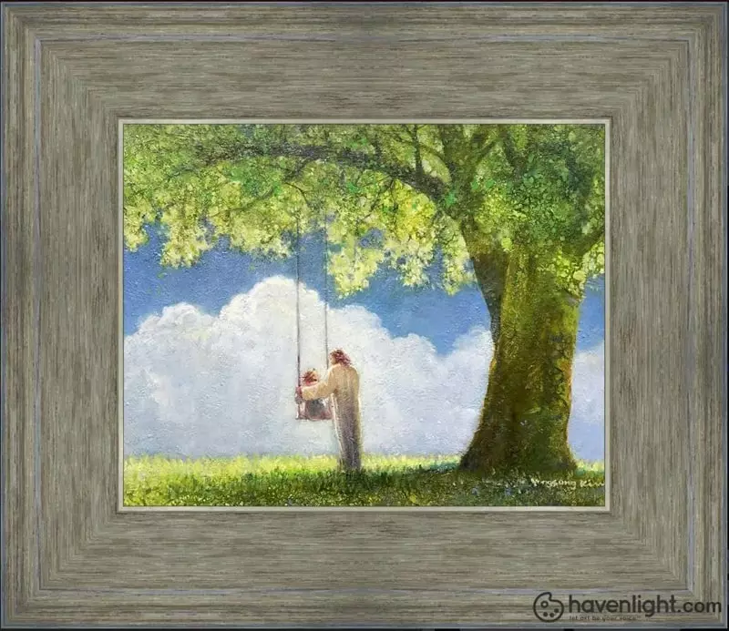 Greatest in the Kingdom by Yongsung Kim features Jesus Christ beneath a tree with a child on a swing.